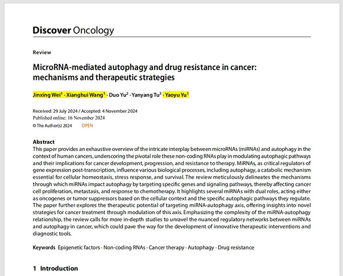 科研创新,捷报频传。近期,SCI还收录了由神经外科学术副院长兼6A神经外一科主任于耀宇担任通讯作者,6A神经外一科魏金星医生、王向辉医生共同担任第一作者在国际学术期刊《探索肿瘤学》(Discover Oncology)发表的题为“MicroRNAmediated autophagy and drug resistance in cancer:mechanisms and therapeutic strategies”(肿瘤中MicroRNA介导的自噬和耐药:机制和治疗策略)的学术论文被SCI收录,影响因子2.8。