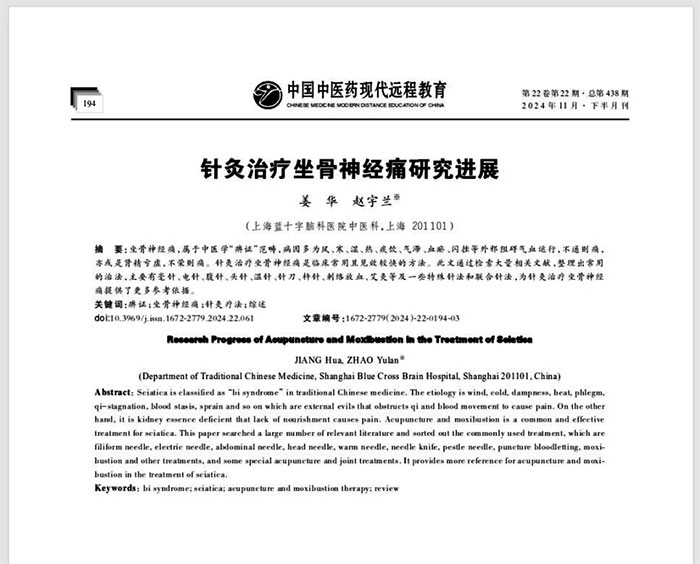 医院一直鼓励并支持各科室各部门开展科研工作,将丰富的临床经验和医学理论知识有机结合,加强科研创新,推动学科纵深发展。在上海蓝十字脑科医院,像任明博士、于耀宇主任这样专注于临床一线,又热衷科研创新的医生并非少数。近期,中医科姜华医生、赵宇兰医生在《中国中医药现代远程教育》发表了学术论文《针灸治疗坐骨神经痛研究进展》。