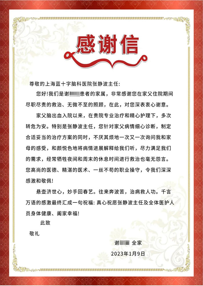 “您高尚的医德、精湛的医术、一丝不苟的职业操守,令我们深深感激和敬佩!”近日,上海蓝十字脑科医院神经内科7A病区张静波主任收到一封设计精美、情真意切的感谢信,患者家属向她表达了真挚感谢,让她倍感欣慰。