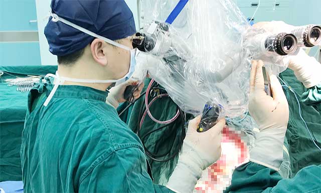 手术开始,吴治群博士主刀,当切开患者硬脑膜后,只见血肿涌出(深红色不健康血液),吸除部分血肿后,患者脑压下降;扩大硬脑膜切口,可见一类似畸形血肿团约3cmx4cmx4cm,血供丰富,在显微镜的助力下,吴博士顺利地切除了血管团,共清除血肿约50毫升,此时患者脑压下降明显,脑搏动良好……在大家2个多小时的齐心协力下,手术终于顺利完成,术后观察患者双侧瞳孔等大等圆,生命体征稳定,已安返重症监护室,并将肿物送检。