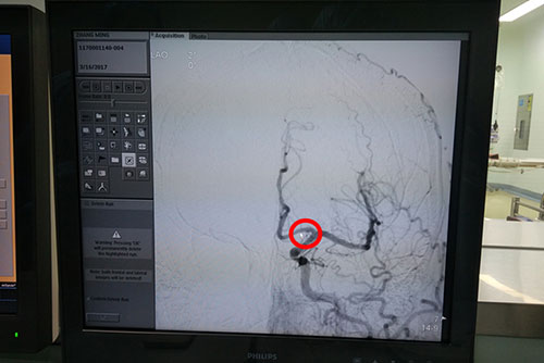 全脑血管造影(DSA)图像:红圈内为出血部位,血管未见异常