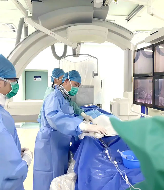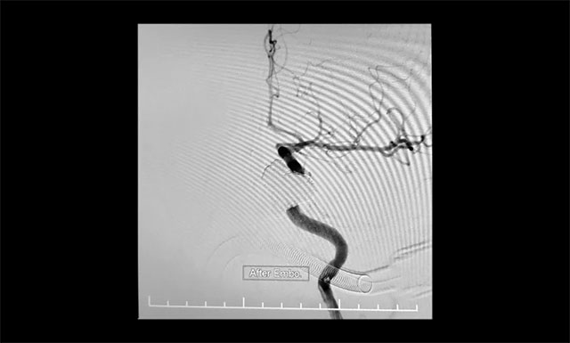经过精心准备,在征得家属同意后,3月5日,张琪博士带领介入团队进行了“颈内动脉球囊保护+弹簧圈+onyx胶联合封堵术”(国际上惯称“钢筋混凝土技术”)。