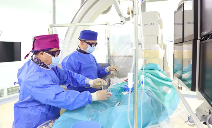 那么,两处“炸弹”分开拆掉还是一并处理呢?针对王大妈的病情,席刚明教授团队展开了分析讨论——如果先对颈内动脉狭窄进行支架置入,会增加二次手术治疗脑动脉瘤的难度,且支架置入后颈内动脉血流改善对脑动脉瘤的冲击力加强,会进一步增加动脉瘤破裂风险。当然,如果仅处理动脉瘤,在全麻中血流动力学的改变可能诱发低灌注造成的脑梗死。最终,席刚明教授、王贵平博士决定为王大妈实施一站式脑动脉球囊扩张术+支架置入术+动脉瘤栓塞术,既能同时解除王大妈动脉堵塞及动脉瘤破裂的风险,又能避免分期手术带来的一系列创伤。