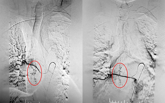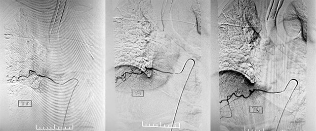 为了定位病灶,3月16日下午1点,在复合手术室,张琪博士在刘春医生、周林华医生协助下通过股动脉穿刺术将造影剂推入各个脊髓间动脉。需要一条动脉一条动脉的试,并且脊髓间动脉复杂,需要非常细致的手法,十分考验医生的细心与耐心。经过两个多小时的连续造影,终于在T8右侧肋间动脉发现瘘口。“造影提示,该处瘘口由肋间动脉供血至硬脊膜静脉,脊髓引流静脉迂曲扩张明显。”张琪博士解释道。