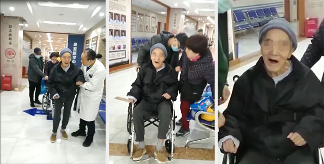 ▲ 3月底的一个星期天,在姚主任的鼓励下,父亲一年来不能走路后第一次走了50米,坐下来休息,张开大嘴笑得如此开心
