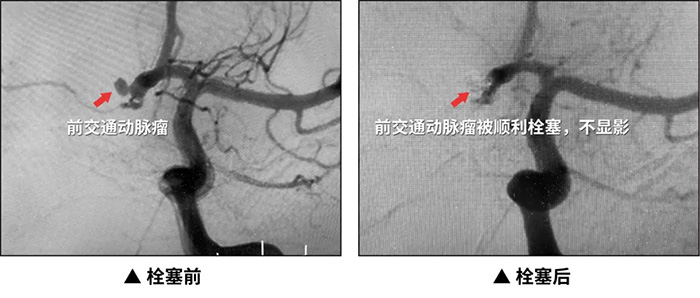 经两小时的精细操作,动脉瘤被成功填塞。造影发现载瘤动脉通畅,动脉瘤不显影,手术成功。方女士最终转危为安。