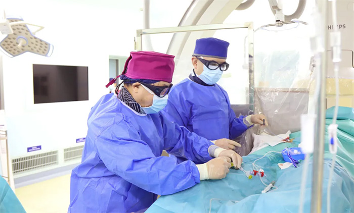 ▲ 4A脑血管病一科主任席刚明教授、4A脑血管病一科副主任王贵平博士在为患者手术
