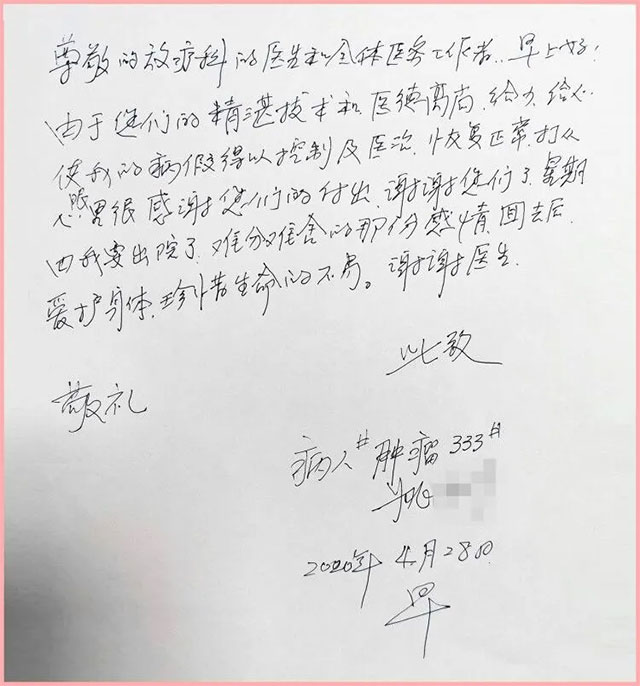 但这次放疗却让她有了不一样的感受,在蓝十字,不仅不用排队,还有病房住,整个治疗过程更是一点痛苦都没有,放疗时间也比较短,一次仅需3~5分钟即可,也未出现其他不良反应;放疗技师态度也很好,因为自己走路不稳,他们每次都会搀扶着她,小心翼翼地将她扶上放疗床,还会叮嘱她放松心情,这些都让她很感动。因此,她写了这封感谢信,以表达自己对放疗科全体医护人员的感激之情。