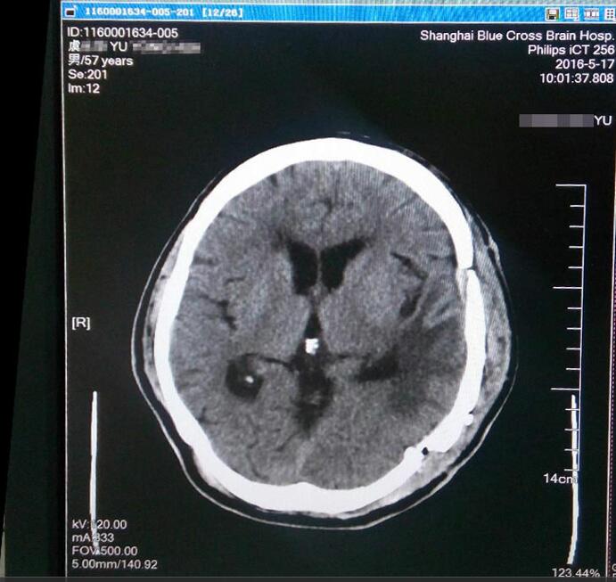 虞文军这才意识到问题的严重性,至当地医院就诊,行头颅CT检查示:左侧颞区底部大脑凸面可见类圆形略高密度占位病变,周围见低密度水肿影,CT值为44HU,大小约为8*6cm,周边脑组织及脑室受压,中线结构右移,额顶部软组织肿胀,考虑为左侧底部脑膜瘤。为求进一步治疗,经过四处打听,虞文军在爱人的陪同下于2016年4月22日前来上海蓝十字脑科医院就诊。