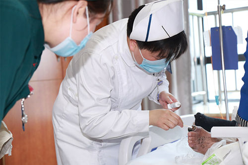 老人的营养吸收状况不佳,还因糖尿病并发症造成足大拇指坏疽发黑,护理这样的患者无疑具有很大的难度和挑战。护士推来了护理车,潘水云护士长三下五除二,熟练地拿出镊子、消毒棉球和药膏,给病人的伤口进行清洗消毒。她一边向患者家属解释,这种药品的疗效很好,请她们放心,一边嘱咐身边的实习护士学习创口涂药的步骤,病人家属对她们的悉心照料表示感谢。老人足部发黑的伤口比之前的几天软化好转了很多。能为如此高龄、患有严重糖尿病足的老人每天都耐心做这样专业和细致的足部护理治疗,还有良好的疗效,这是非常难得的。潘水云护士长认为: “作为一位99岁的老人,保持生命的质量和尊严非常重要。”
