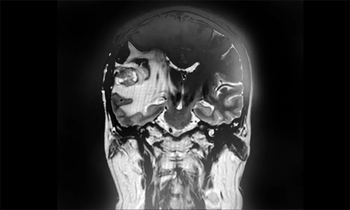 卢云鹤博士为患者进一步完善检查。MR检查示右侧颞叶内见环片状混杂信号,大小约20mm*18mm,强化与水肿明显。周围脑沟、裂显示欠清;右侧侧脑室受压变形,中线结构稍左偏,出现可疑脑膜转移。