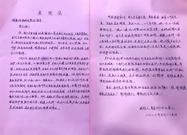 家属实在是感激不尽,写了感谢信给院办盛赞李鲁萍医疗团队及全院医护人员。