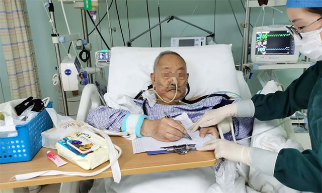 李鲁萍主任回顾道,“当时,我接到这个病人的时候已经很晚了,我们单号医疗组一起接待了这个特殊的病人。后来一查体,病患年事已高,基础性疾病又多,主要是慢性阻塞性肺炎让他不能呼吸,肺里全是痰,当时他CO2含量高达89,家属又要求不切开气管,我们只能给他插管子救治,一连插了5根管子。”9楼ICU住院患者都是危重病患,当时,他是唯一不被切开气管救治的患者。