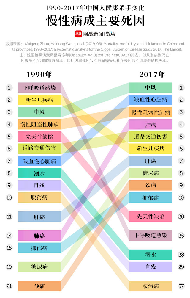 国际权威医学杂志《柳叶刀》于2019年6月发表了一篇论文,分析了1990年到2017年中国34个省份(包括港澳台)居民的死亡原因。中国人目前的第一大死亡原因,是中风;第三大死亡原因,是肺癌。