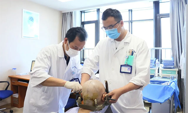▲ 刘主任为患者装上头架,为手术做准备