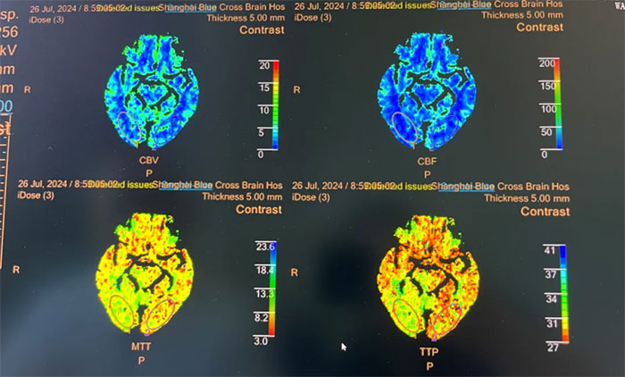 ▲ 头颅CTP显示右侧顶枕颞叶局部脑组织灌注较对侧稍减低