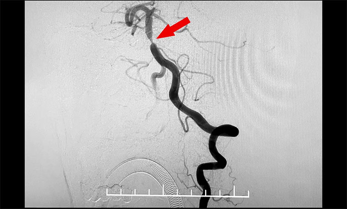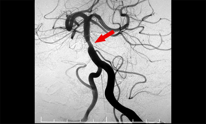 基底动脉位于颅内,且紧贴脑干,外科手术治疗基底动脉狭窄几乎没有可能,而对于重度狭窄的病人来说,单纯药物治疗收效甚微,神经介入治疗是唯一选择。但是基底动脉手术难度大、风险高,由于基底动脉穿支多,稍有闪失将会导致患者严重的手术相关脑卒中,对于手术操作技术的要求极高。席刚明教授团队决定迎难而上,在充分做好手术预案后,决定在全麻下行经皮基底动脉球囊扩张成形术+支架置入术,及时开通血管,挽救患者生命。