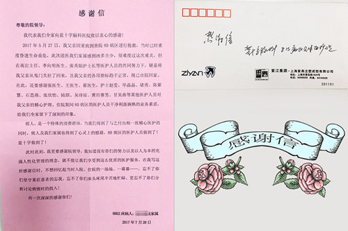在医生与患者经历了共同抗争病魔的一个月后,没有什么比人与人之间温暖朴素的情意更能慰藉患者脆弱的心灵,也没有什么比这份情意更能慰藉医护人员的辛劳。除了这封感谢信,阮老先生的女儿还为8B病区的医生护士精心制作了两面锦旗,在阮老先生出院后十多天,她专程驱车把锦旗和感谢信送到“蓝十字”,情景实在让人动容。