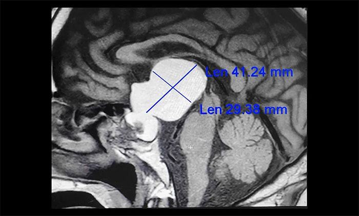 通过进一步完善头颅磁共振检查,提示患者鞍区囊性占位病变,考虑为颅咽管瘤,瘤体最大直径超过4cm。