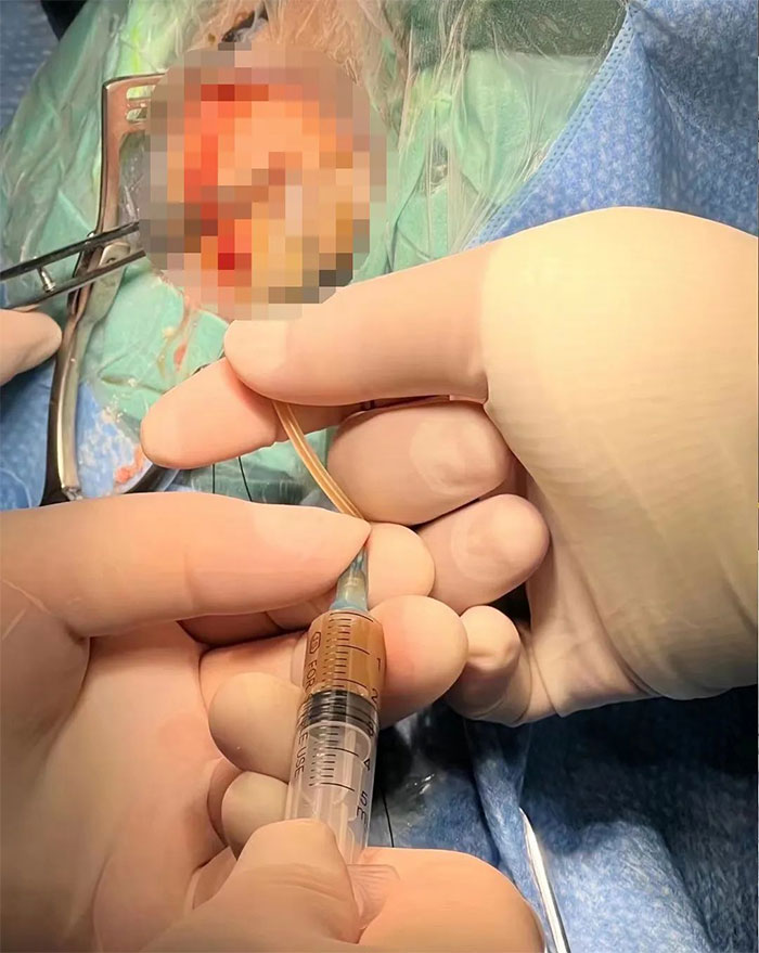 通过精准定位,使用专门的穿刺管从骨孔穿刺脑组织,穿刺至计算设定深度后拔出枕芯,黄色粘稠液体随即流出,共引流出16ml,留取部分液体送检进行病理分析。再顺利置入Ommaya囊,引流管引流顺畅,手术取得成功。