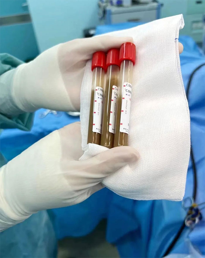 ▲ 引流抽取黄色粘稠液体