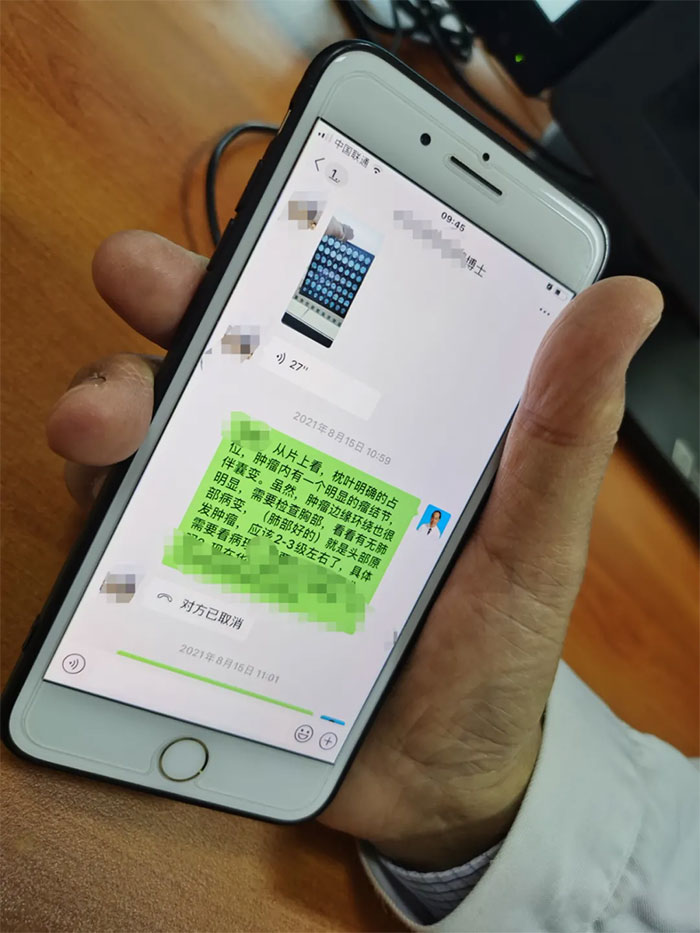 了解到舅舅病情后,曾在上海某三甲医院工作的王博士立即通过微信联系上海蓝十字脑科医院神经外科潘仁龙主任。根据磁共振影像,潘仁龙主任指出:“从片上看,枕叶明确的占位,肿瘤内有一个明显的瘤结节,伴囊变。虽然肿瘤边缘环绕也很明显,需要检查胸部,看有无肺部病变,肺部好的就是头部原发肿瘤,应该在2-3级左右了,具体需要看病理。”一番交流后,王博士建议舅舅到蓝十字脑科寻求进一步治疗,潘仁龙主任随即安排好住院相关事项。
