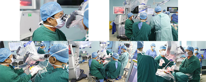 术中,在蔡司显微镜(双荧光)下,徐庆怀教授在神经外科宫卫东教授等协助下,从右侧额颞入路,见肿物直径约8cm,呈暗红色鱼肉样,中间黄褐色囊液约10ml,边缘胶质增生伴水肿带,水肿带呈黄白色。瘤体巨大且质地柔软,在保护重要血管、神经核团及纤维束的前提下,小心分离肿瘤与脑组织并完整切除,肿瘤标本送检。整台手术历时3小时顺利完成,患者安返监护病房进一步观察。