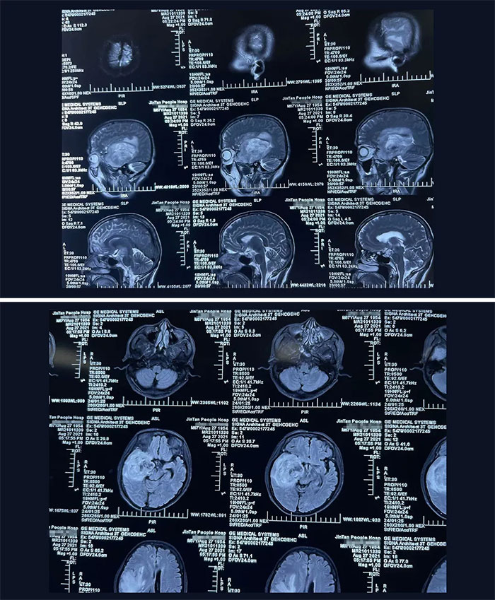 家住江苏省某市的林先生(化名)今年68岁,从事业单位退休下来已经八年了。今年7月,林先生被车撞了一下,当时感到持续性头痛,伴左侧肢体乏力持续加重,在家人陪同下前往当地医院就医。因为平时每年单位都会组织退休员工进行体检,除了头部不做CT及核磁共振MRI外,其他身体部位都体检到的,除头部外身体各处无恙。现在这一查头部,着实让他及家人吓了一大跳。林先生右侧丘脑、基底节、颞叶占位病变,占位体积巨大,最大直径约 8cm,呈浸润性生长、边界不清,周围大片水肿带;脑干、右侧侧脑室受压变形,中线结构受压向左偏移11mm。考虑为脑恶性肿瘤,胶质瘤可能性大。