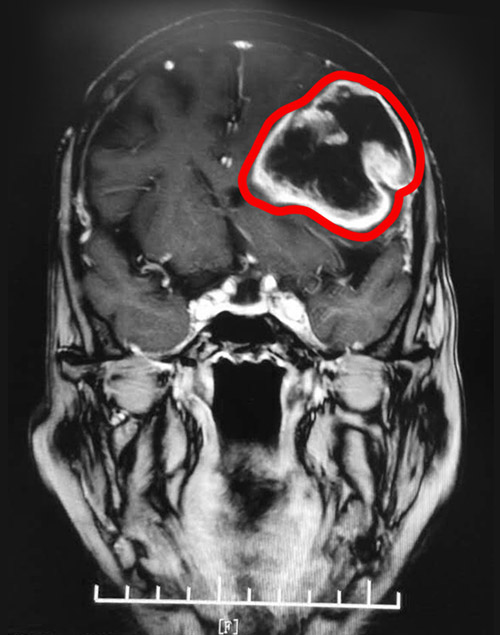 ▲MRI影像显示,患者左脑有一个大小约5.8*5.6cm的肿瘤