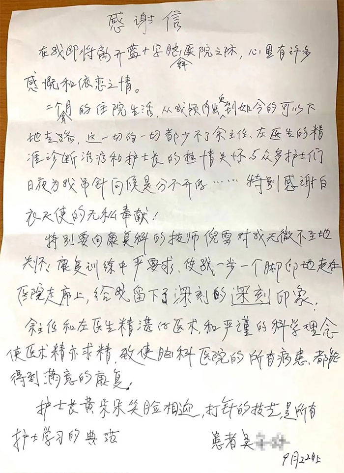 二个多月的住院生活,从我颅内出血到如今可以下地走路,这一切的一切都少不了余主任、左医生的精准诊断治疗和护士长的热情关怀与众多护士们日夜为我吊针问候是分不开的……特别感谢白衣天使的无私奉献!