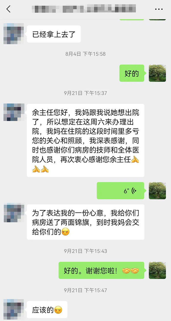 得悉母亲的恢复情况,吴阿姨的女儿也满心欢喜。作为医疗界的同行,她对医院的技术、理念和服务都深为赞同,对于母亲的迅速康复更是满怀感激,并为此特意定制了精美的锦旗,叮嘱吴阿姨一定要亲手交给余志良博士。