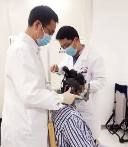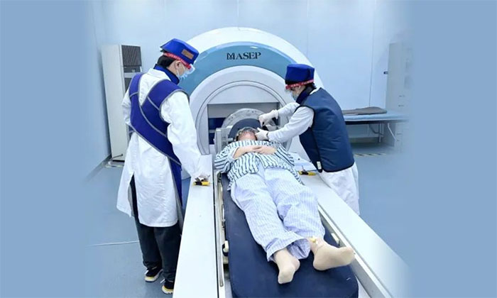 第二步,开展头部伽玛刀治疗,通过高能伽玛射线照射病变组织,毁损靶区肿瘤组织。