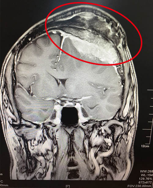 术前核磁显示:左侧额部(大脑凸面)侵袭性脑瘤,侵及颅骨和软组织