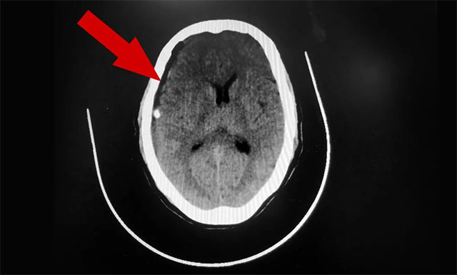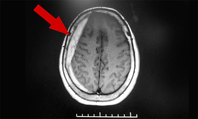 ▲ 患者右侧额颞部颅骨内板下方呈新月形高密度影