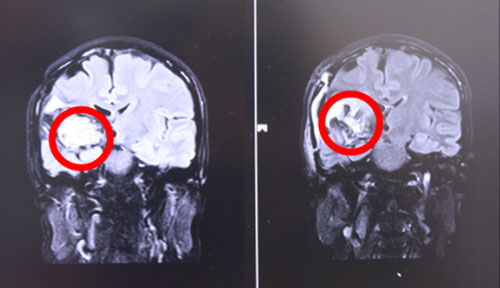 但由于肿瘤较大且位置敏感,已累及到基底节和内囊,患者出现的癫痫、左侧肢体无力等皆与上述结构损害有关,虽然应尽快切除干净,可肿瘤位于丘脑运动区,内分泌和植物神经中枢,靠近倒裂大血管。对手术医生的技艺也是极大地考验,稍有不慎患者术后瘫痪的可能性极大。权衡再三,在自身风险与病人风险之间,专家们始终把患者生命摆在首位,决定为患者实施肿瘤切除手术,并制定了行之有效的手术方案。