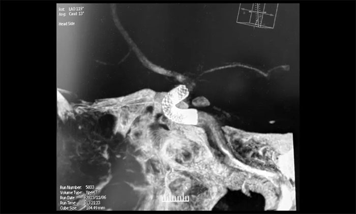 充分完善术前准备后,11月6日上午,席刚明教授在麻醉科和介入手术室紧密配合下,历时两个小时顺利进行了右颈内动脉眼动脉段多发动脉瘤血流导向装置(Pipeline)置入术。术中,微导管到位后缓慢释放血流导向装置到达术前预定位置,造影显示血流导向装置贴壁良好,完全封闭了动脉瘤瘤颈。多角度复查造影显示,动脉瘤瘤腔内有明显造影剂滞留,载瘤动脉和分支血管血流正常。术后CT检查,颅内未见出血,手术顺利完成,顺利拆除埋在患者脑子里的“不定时炸弹”。术后,患者顺利苏醒,无新发神经功能缺损。目前,患者已康复出院。