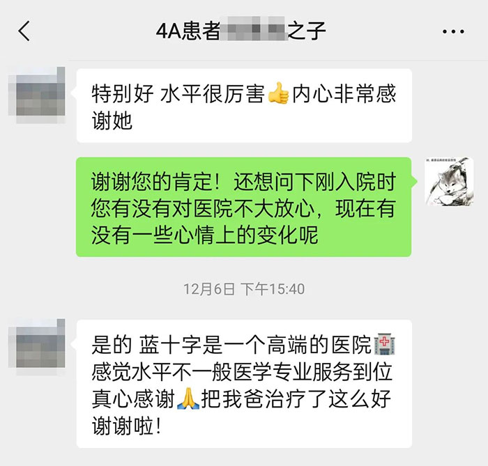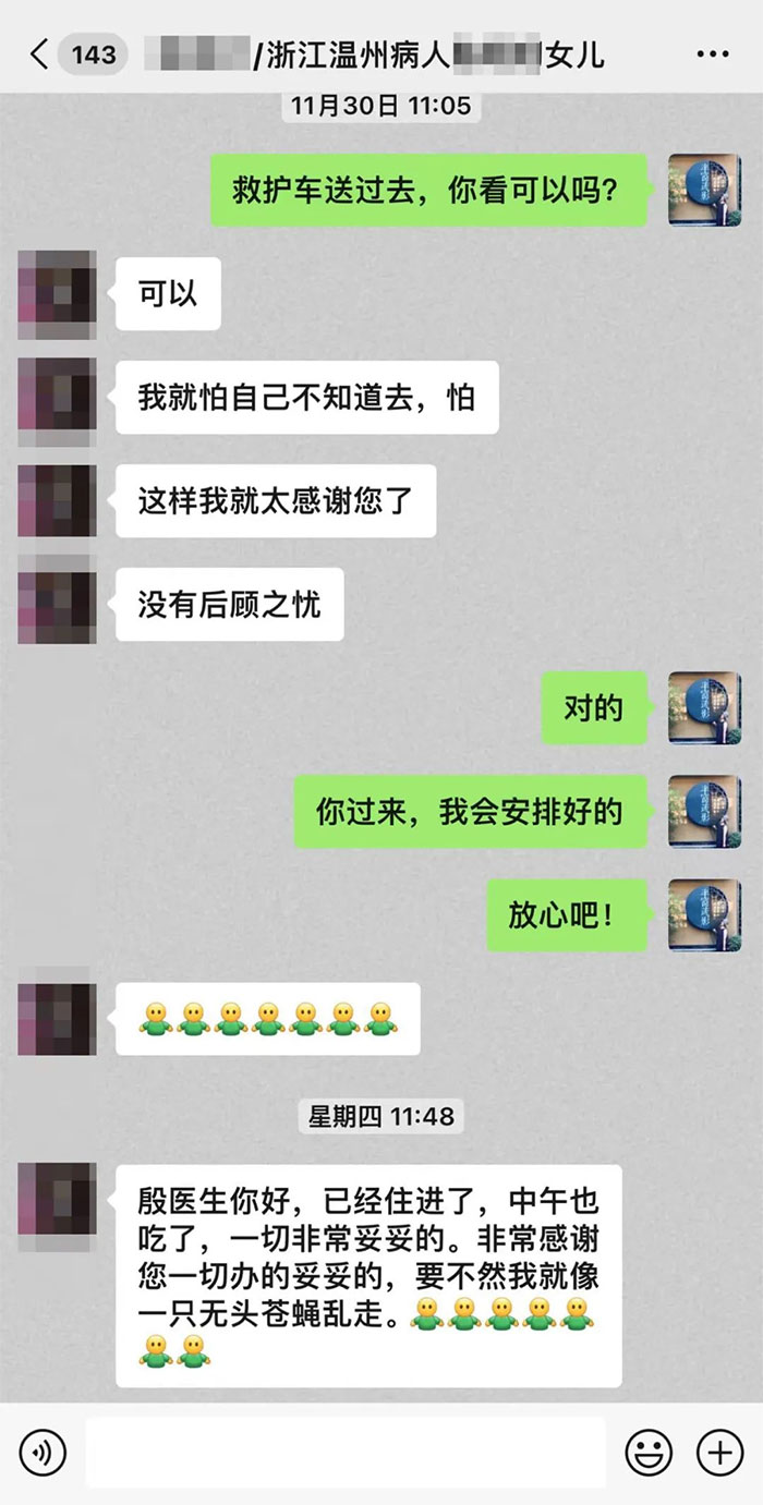 陈伯伯的女儿陈女士对殷主任及其团队非常感激,直言:“(蓝十字)医院条件好啊,效果好啊,不虚此行。”没想到在蓝十字的18天里,陈伯伯能够得以好转并具备可接受手术条件。在安排转院后的微信联系中,陈女士毫不掩饰地回复殷主任:“非常感谢您一切(转院对接事项)办的妥妥的,要不然我就像一只无头苍蝇乱走。”在手术成功后陈女士高兴地委托病房护工送来锦旗,并给殷主任发消息:“一切在不言中,心里非常温暖。”
