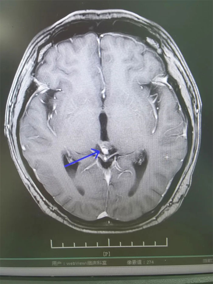 在当地医院行MRI检查提示:鞍区及松果体区异常信号,幕上脑积水,右侧乳突少许炎症。9月,患者在外院行经蝶窦鞍区病损切除术,术后病理示:生殖细胞瘤。